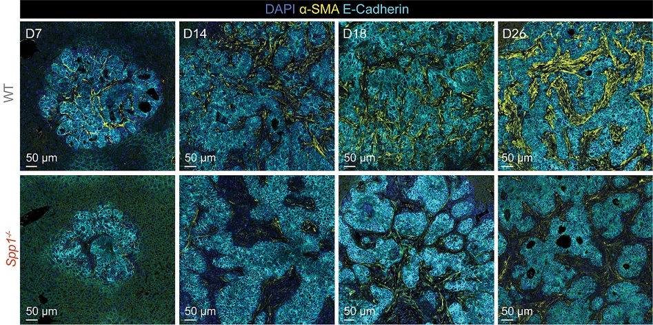 Las diferencias en el microambiente tumoral de animales que no expresan osteopontina (SPP1) son suficientes para aumentar la eficacia de la inmunoterapia. En la imagen se observa una triple tinción: E-cadherina, que identifica las células tumorales, α-SMA, que marca los fibroblastos asociados al tumor, y DAPI, que tiñe el núcleo de todas las células. Imagen: IRBBarcelona.